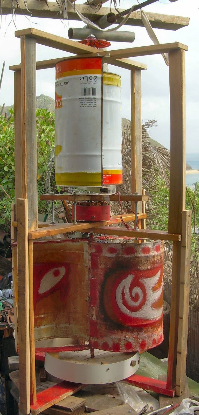 Nevertheless I decided to built a horizontal working wind generator this is because I live near the Atlantic Ocean and I have enough wind to make with smart no professional solution about 50 W of the wind is bothering me and I thought how could I use this went how could this secondly it would be nice exercise from me to build such a mechanical electrical machine I didn't want that much money so I decided to use recycled material I was worn I like to constrict missions which I understand and which I can repair making it electricity it is much ready to use the power of the sun directly by using footwork like photocells but for the cell is a thing which works or works not and I hardly understand how it works it is a black box for me when I build a windmill I understand this mechanic I only know and understand magnets and I know how to make electricity with moving electrons in an magentic field. they told methat an electron it's a little thing which carriers charge and spins around in a spinning charge that are now from physics acts like a magnet then if you move on external magnet around the electron's which themselves behave like little magnets. I think understand this process and all parts I can repair by myself at least I also am a painter and decided to use the wings of Savonius horizontal planes from making some nice paintings thought this would be a work of art and it would be nice if funding is moving and perhaps making little bit of electricity some of the people know they somebody in the living I only want to make about 10 or 20 Watts from this using somechagge little abtteries of 1.5 Volts and listen a little radio music and it is efficient for handy batteries 3 times 1.5 batteries so to call emergency I don't think that it's possible for a nonprofessional worker charged batteries of car and using a 12 V car batterie for this young you need to take generation at least hundred watts that means diameter of 3 m or gearing generator and this is not the solution for me.